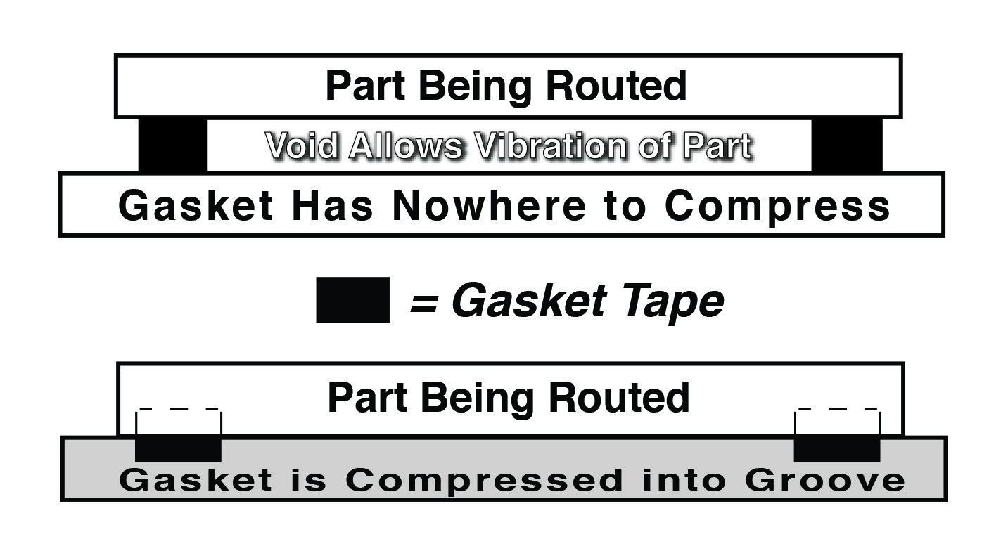 Using the router to create a grid connecting the vacuum ports allows the vacuum to reach all edges of the part to be machined. This will increase the holding power of vacuum system and allow better edge finishes due to a rigid holding configuration. Using proper gasketing tape in an oversized channel will also increase the lifetime of the spoil board. If the tape used is not for gasketing applications and has "memory", it will not expand back to its original state after repeated compressions and the vacuum system may begin to bleed off. Additionally, if the channel is not oversized, when the tape is compressed by the part it will have nowhere to go. This may prevent the part from contacting the vacuum surface and allow vibration to occur.